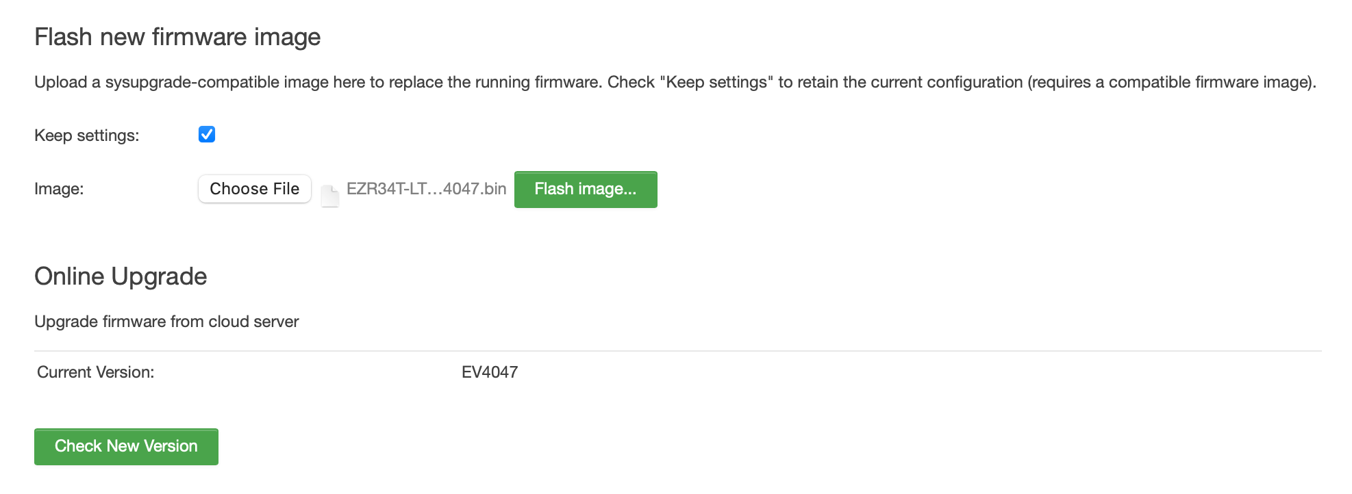 <figure><img src="https://1844126334-files.gitbook.io/~/files/v0/b/gitbook-x-prod.appspot.com/o/spaces%2FdxJnOVEQ0wYZZ2y8MkMF%2Fuploads%2FFyB5koPsLryiWUm6fJko%2FEZR34T-Outdoor-Router-Flash-Firmware.png?alt=media&#x26;token=5d0126ee-d1a8-4d97-85ef-3ecb027849d8" alt=""><figcaption><p>Flash New Router Firmware - Local and Online Upgrade</p></figcaption></figure>