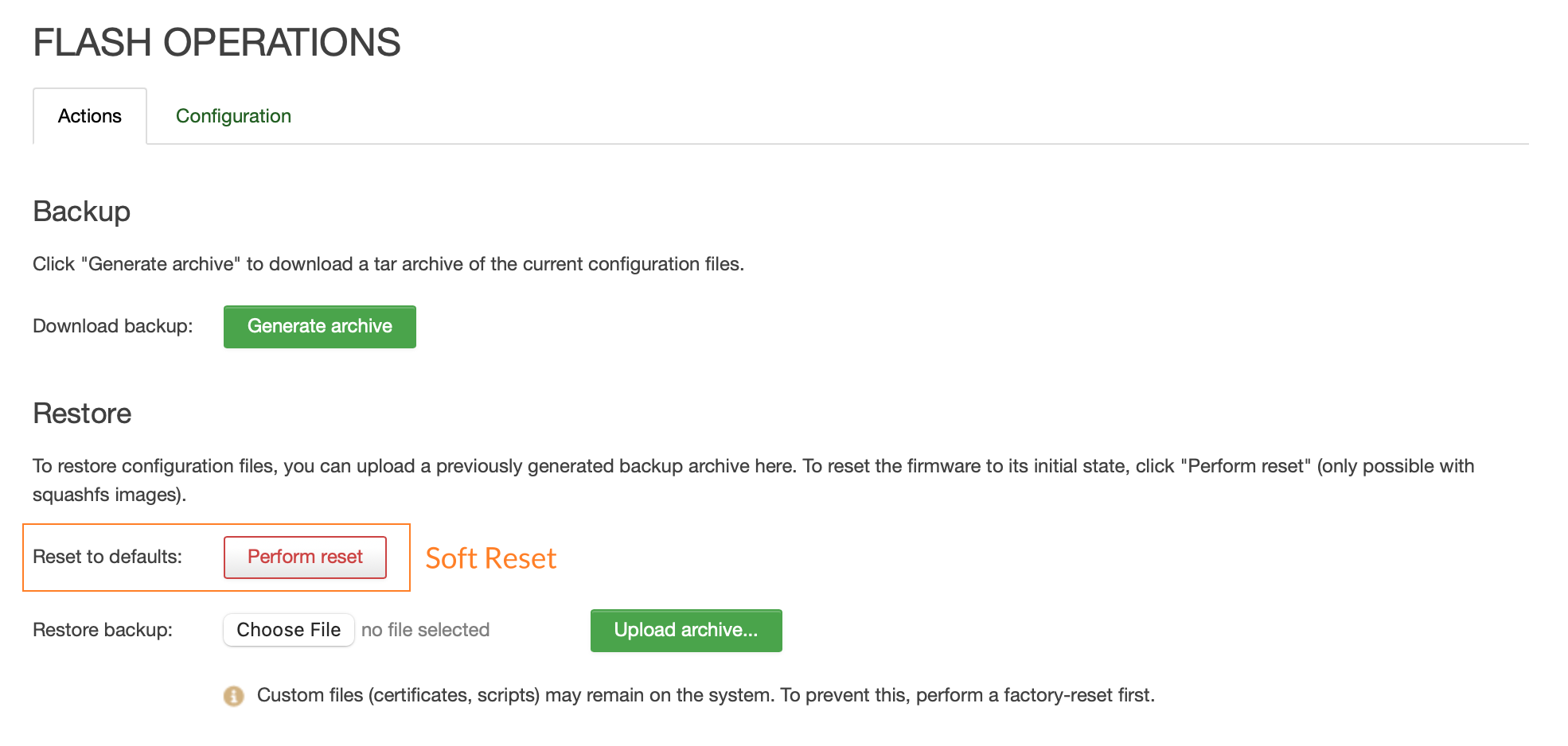 <figure><img src="https://1844126334-files.gitbook.io/~/files/v0/b/gitbook-x-prod.appspot.com/o/spaces%2FdxJnOVEQ0wYZZ2y8MkMF%2Fuploads%2FYQxKZ6a5g7aM5ErRaI9Q%2FEZR34T-Outdoor-Router-Soft-Reset-Button.png?alt=media&#x26;token=05fcec65-e7df-478d-8bab-e244e49b03b2" alt=""><figcaption><p>Soft Factory Reset - Button: Perform Reset</p></figcaption></figure>