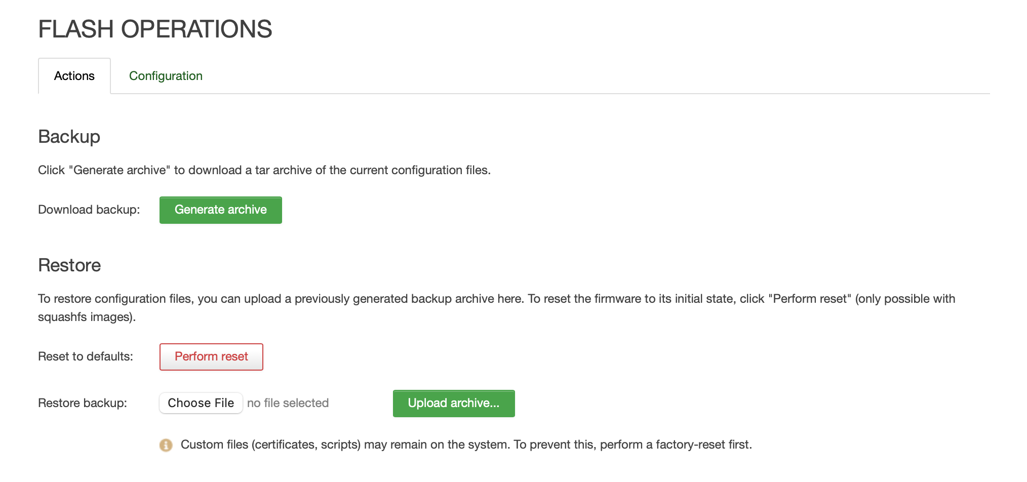 <figure><img src="https://1844126334-files.gitbook.io/~/files/v0/b/gitbook-x-prod.appspot.com/o/spaces%2FdxJnOVEQ0wYZZ2y8MkMF%2Fuploads%2FqDw84GEjot2lFRRaDo3n%2FEZR34T-Outdoor-Router-Backup-Restore.png?alt=media&#x26;token=f615e9b0-06eb-4667-8404-97b87fca3c75" alt=""><figcaption><p>Backup and Restore Router Configuration Archive</p></figcaption></figure>